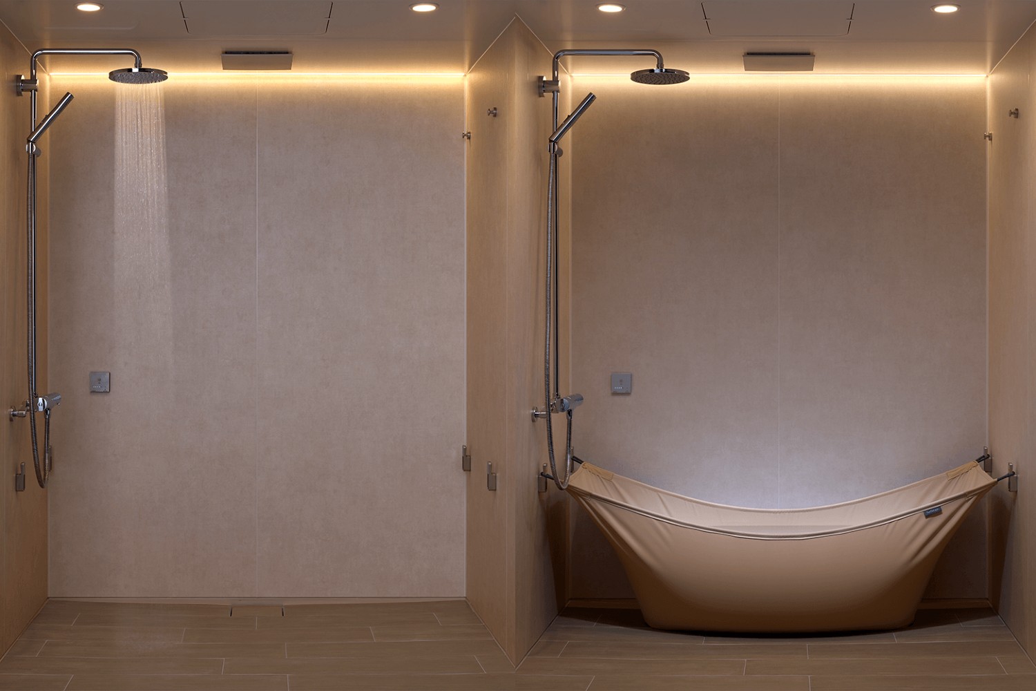 As the company explained on Designart Tokyo’s website, Lixil created Bathtope to celebrate the company’s first hundred years working with plumbing and bathroom products. “[T]he concept we derived is an ambiguous style that is neither a shower room nor a bathroom, and the idea came from the traditional Japanese concept of haretoke,” they wrote — in this case, creating a space that could function as both a standing shower and a bathtub.