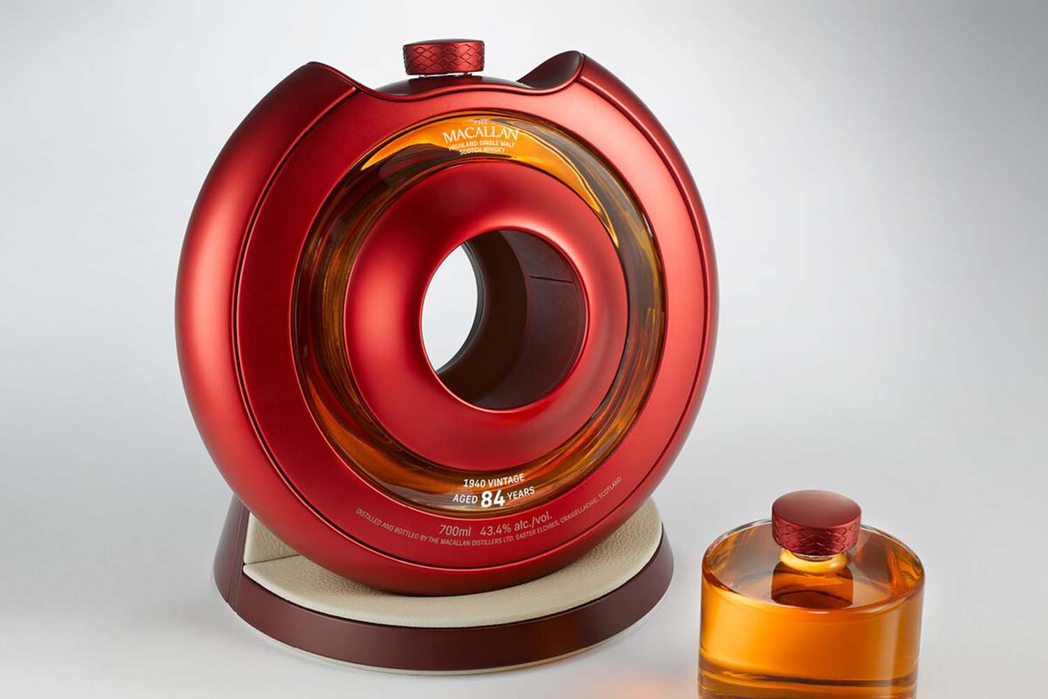 It’s no surprise that this price tag is attached to a new release from The Macallan. The Speyside distillery, known for some of the whisky world’s most lavish releases, recently announced TIME : SPACE, a new dual chamber whisky set that features a 1940 vintage liquid and a five-year-old single malt from The Macallan’s new $250 million distillery. The 84-year-old whisky comprises two casks selected from a first-fill American oak butt and a second-fill European oak butt, both seasoned with sherry in Jerez de la Frontera and matured in Scotland. Both bottles are housed in a circular oak vessel that displays them in a unique structure (complete with a removable flask).